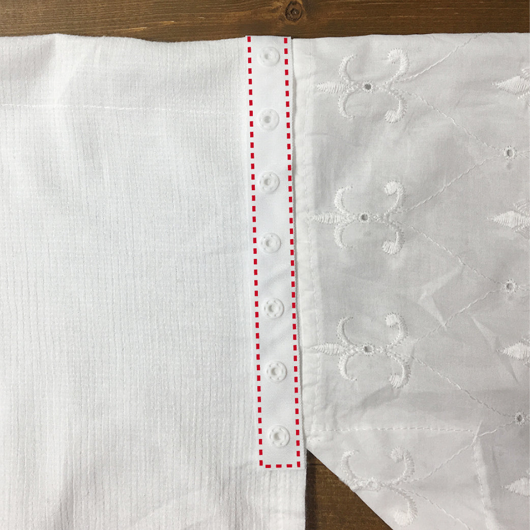 安全ピンや直接縫い付けるのも可能ですが、Juponeの替そではスナップテープ(別売)で取り付けるのをおすすめしております。